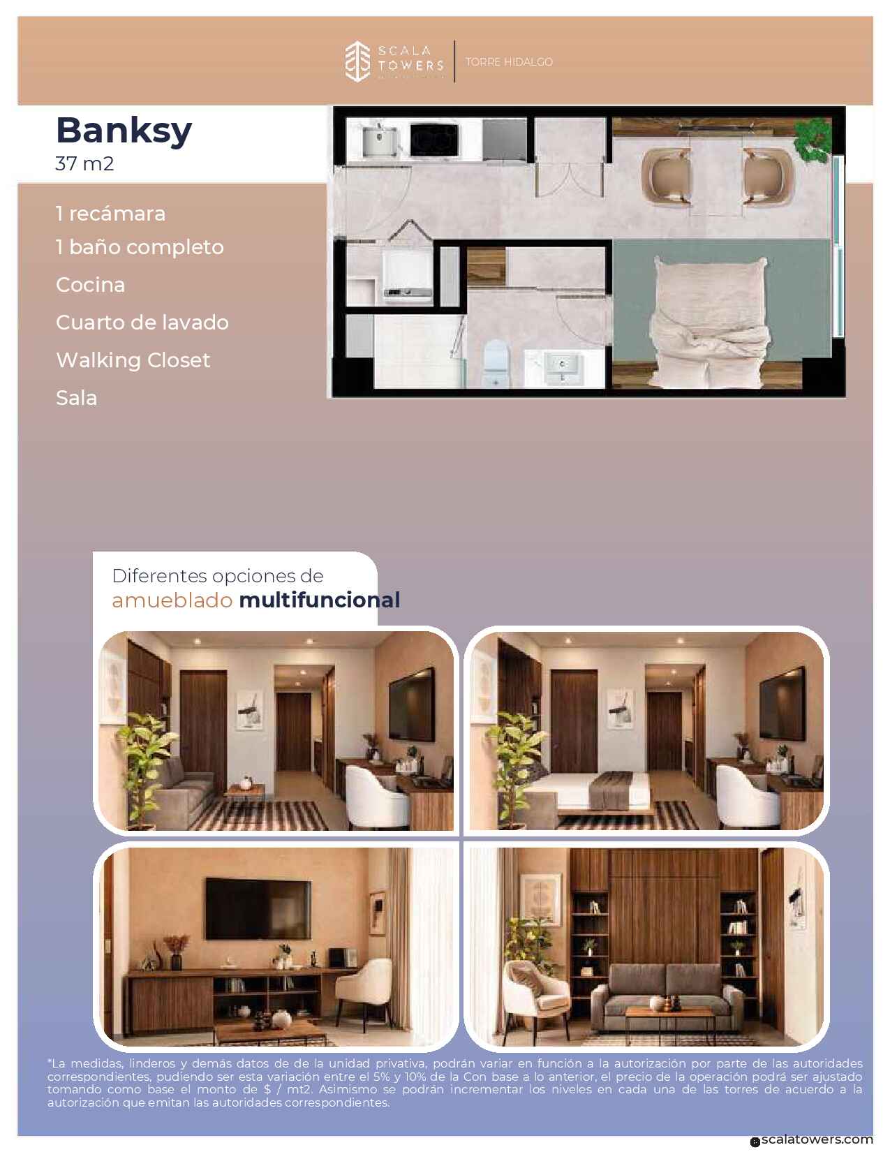El proyecto se integra por tres torres icónicas que fusionan el entorno residencial con una base comercial estratégica. La unidad de 37 m2 (Banksy) es una lección de eficiencia arquitectónica, logrando integrar 1 recámara en una superficie optimizada para maximizar el canon de renta. El desarrollo cuenta con amenidades de alto rendimiento operativo como Sky Bar, Coworking, Gym y Alberca, diseñadas para atraer al perfil de inquilino corporativo y digital que busca experiencias «all-in-one».