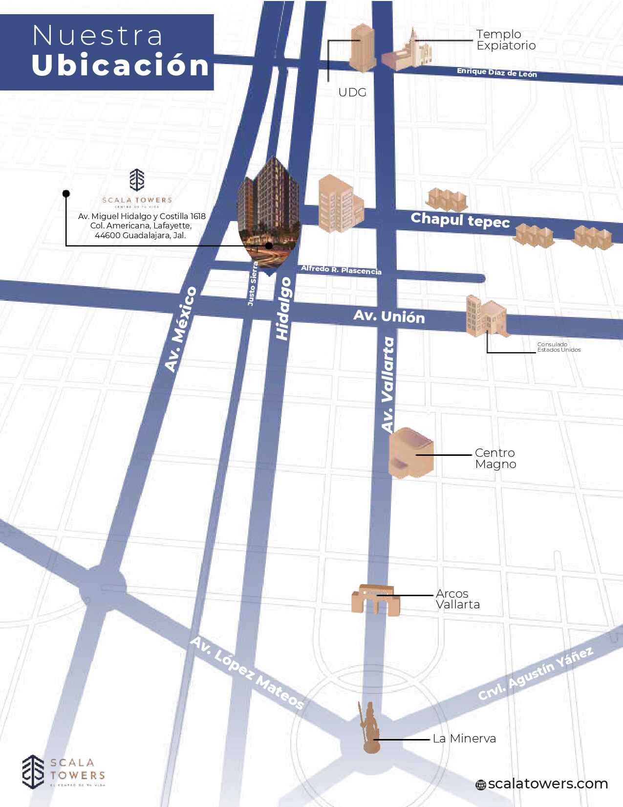 Estratégicamente situado en Av. Miguel Hidalgo y Costilla 1618, Scala Towers domina el horizonte de la Colonia Americana, recientemente nombrada como uno de los barrios más dinámicos a nivel global. Esta ubicación ofrece una conectividad privilegiada con el corredor financiero de Av. Chapultepec y el centro histórico, garantizando un Walk Score excepcional de 99%. Invertir en este cuadrante es posicionarse en un área donde la demanda de vivienda vertical supera por amplio margen a la oferta disponible, blindando la inversión contra ciclos económicos.